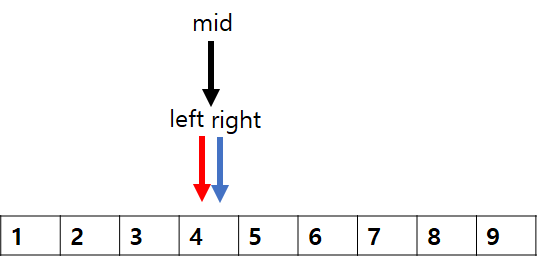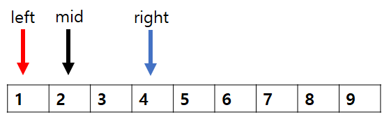 이 포인터를 각각 left, right, mid라고 명칭하겠습니다.