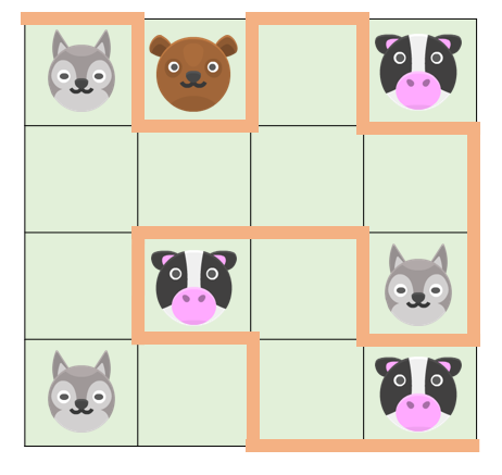 저는 문제에 접근할 때, 1) N*N크기를 갖는 동물의 위치를 표시하는 행렬 , 2) N+1*N+1 크기를 갖는 국경의 꼭짓점을 표시하는 행렬을 통해, 동물과 국경의 위치를 나타내고자 했습니다.
